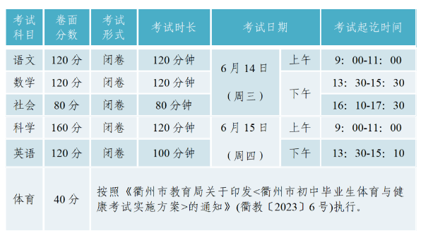 根據三衢教育公布的《2023年衢州市初中學業水平考試與高中招生工作通知》據悉,2023年浙江衢州中考時間已公布,安排在6月14日至6月15日期間舉行,總分為640分。具體如下: