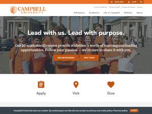 坎貝爾大學成立于1887年,是一所非營利性私立高等教育機構,位于北卡羅萊納州Buies Creek(人口范圍為2500-9999人)中等城市的郊區。坎貝爾大學(CU)是一所中等規模(uniRank招生范圍:7000-7999名學生)男女同校的美國高等教育機構,正式隸屬于基督教浸禮會,由南方學院協會學院委員會正式認證。坎貝爾大學(CU)提供獲得官方認可的高等教育學位的課程和計劃,如若干研究領域的學士前學位(即證書、文憑、副學士或基礎)、學士學位、碩士學位、博士學位。有關更多詳細信息,請參見下面的uniRank學位等級和學習領域矩陣。這所擁有133年歷史的美國高等教育機構根據入學考試和學生過去的學習成績和成績實行選擇性錄取政策。入學率在70-80%之間,這使得這家美國高等教育機構在某種程度上具有選擇性。國際申請人有資格申請入學。CU還為學生提供若干學術和非學術設施和服務,包括圖書館、住房、體育設施、經濟援助和/或獎學金、出國留學和交流計劃、在線課程和遠程學習機會,以及行政服務。
