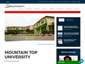 山頂大學成立于2015年,是一所私立高等教育機構,位于奧貢的Makogi Oba。山頂大學(MTU)是尼日利亞國家大學委員會正式認可的男女同校的高等教育機構。山頂大學(Mountain Top University,MTU)提供獲得官方認可的高等教育學位的課程和項目,如若干研究領域的學士學位。有關更多詳細信息,請參見下面的uniRank學位等級和學習領域矩陣。MTU還為學生提供一些學術和非學術設施和服務,包括圖書館,以及行政服務。