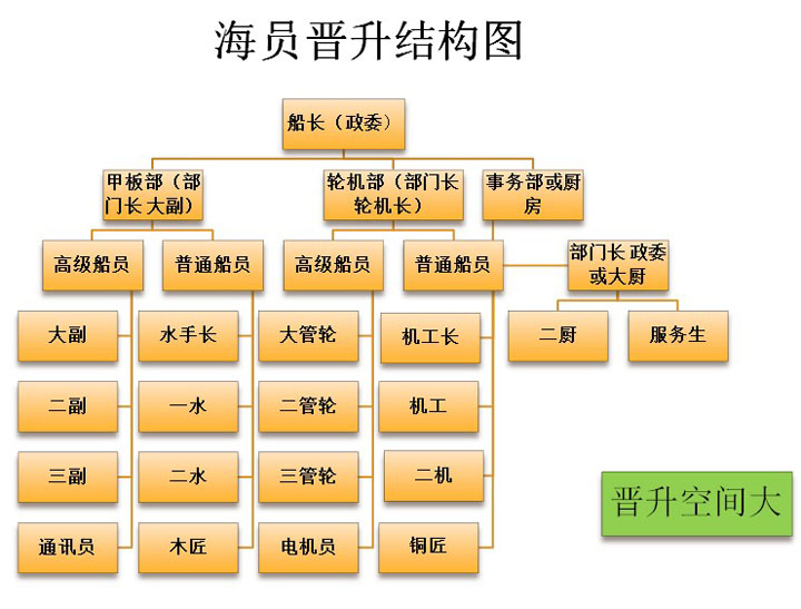 職務層次:按職務層次劃分,海員分為高級海員和普通海員兩大類。高級海員從事技術管理工作;普通海員(水手、機工)從事一般技術性工作。按專業性質劃分,分航海技術專業和輪機工程專業。分別負責船舶航行和船舶機械的維護保養。