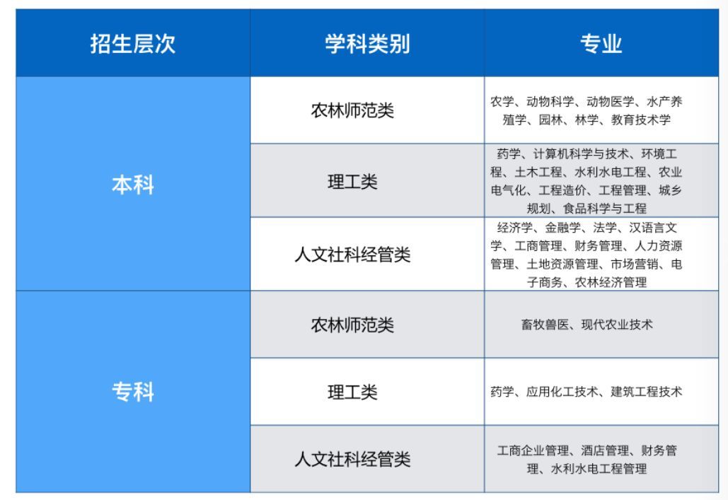 四、專業:本科專業農學、動物科學、動物醫學、水產養殖學、園林、林學、教育技術學、園藝*、藥學、計算機科學與技術、電子科學與技術*、環境工程、土木工程、水利水電工程、農業電氣化、工程造價、工程管理、城鄉規劃、人文地理與城鄉規劃*、生物工程*、木材科學與工程*、食品科學與工程、經濟學、金融學、法學、漢語言文學、工商管理、財務管理、人力資源管理、土地資源管理、市場營銷、審計學、國際經濟與貿易、投資學、酒店管理*、農村區域發展、電子商務、社會體育指導與管理、社會工作、視覺傳達設計、農林經濟管理