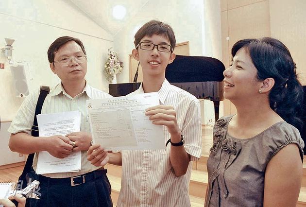 現年14歲的高考生伍國頌,昨日於父母陪同下放榜,笑言不想他人稱自己為神童,只是一心想升讀大學的化學課程,日后成大學教授作育英才。